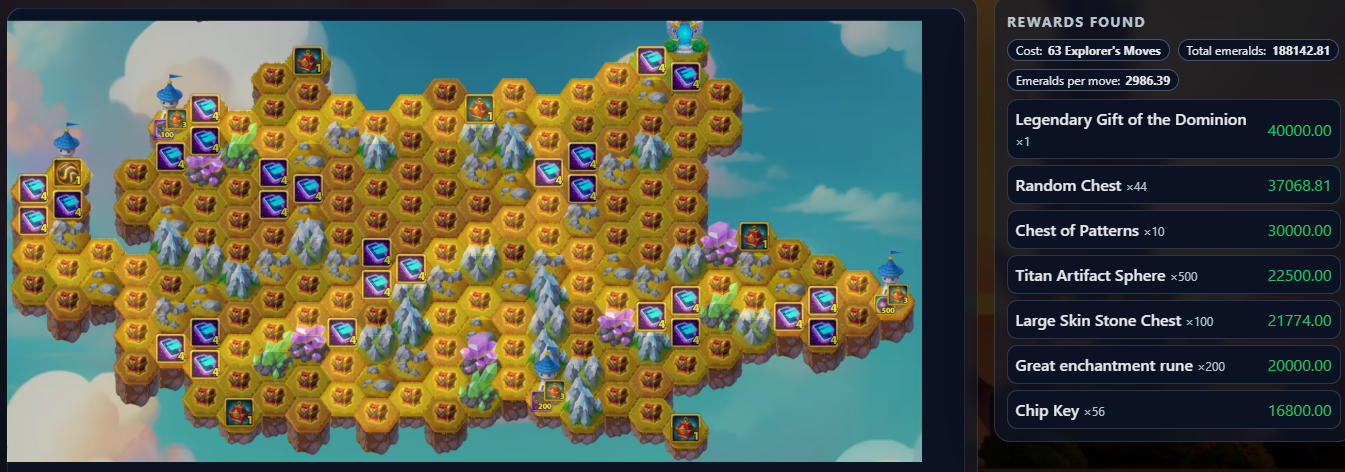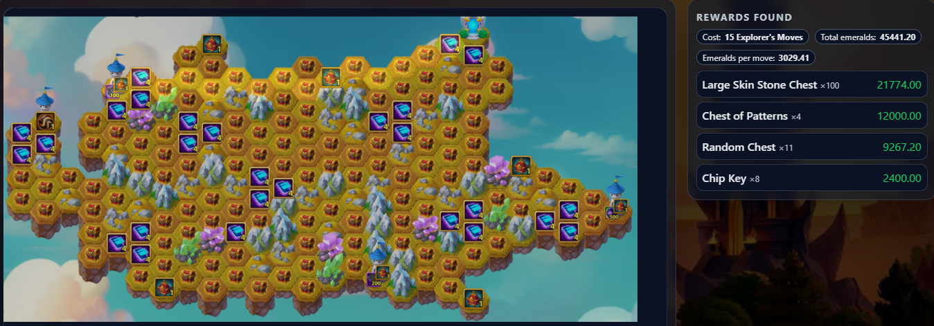 This map is better than Electra but worse than November in Emeralds per Move. Overall recommendation: skip Cyber Con and save your moves. If you have lots of moves and still want to spend them, prioritize the November map first for better efficiency (3735 or 3671 EpM for 63 or 57 moves). If you really want to explore this map, the best option is Path #1 — 15 moves for 100 Large Skin Stone Chests, worth about 3,029 emeralds per move (If you need lots of skin stones).